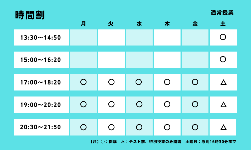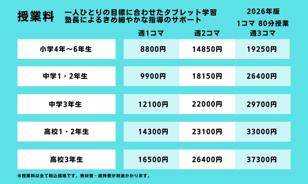※入塾金11000円(入塾時のみ)、年会費16500円(年度の途中入塾の場合は月割り計算)をいただきます。2022年11月現在の価格です。高校生は内部進学および保護者様のご紹介のみ受け付けいたします。高校生は学力・志望校に応じてテキストが変わるため、必要なときに購入していただきます。